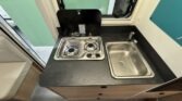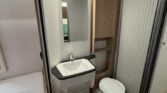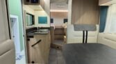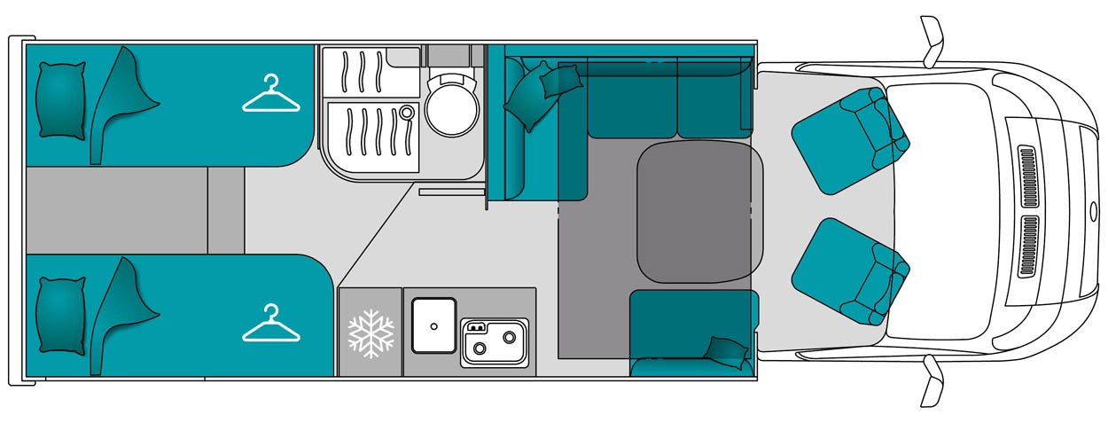 • L’agencement du mobilhome 75T est fait pour partir à 4 ou à 5. Le salon, lieu principal des beaux moments de vie et de partage, a été privilégié. Les espaces nuit sont bien répartis. La cuisine est fonctionnelle pour préparer des repas pour 4. La salle d’eau est astucieuse, elle limite son encombrement et offre en même temps un très grand volume, que ce soit en mode douche ou toilettes.