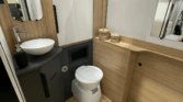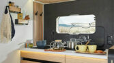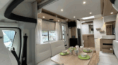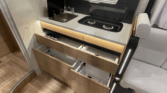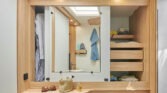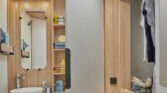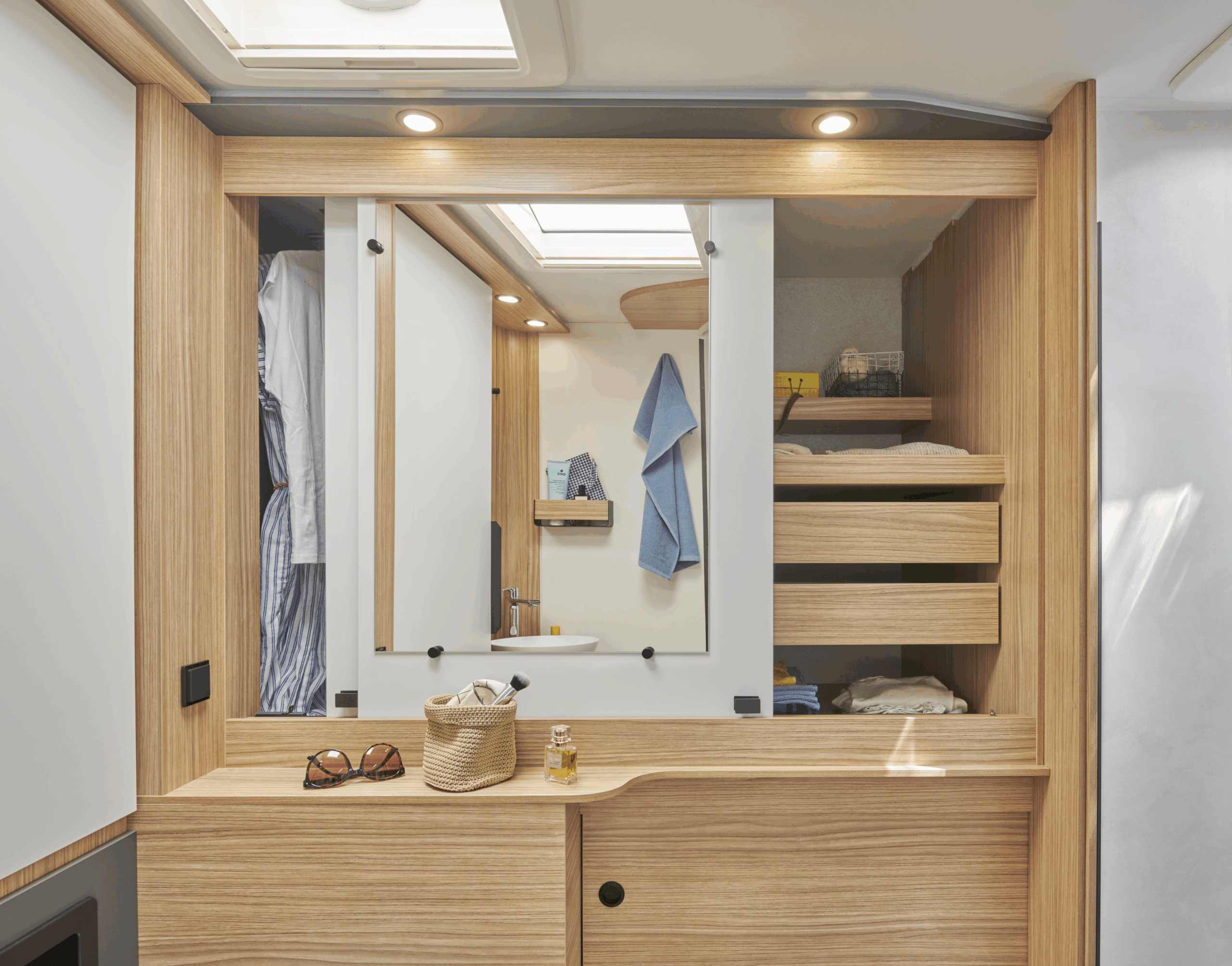 • L’une des particularités du modèle est sa grande salle de bain traversante à l’arrière, qui fait toute la largeur du véhicule, intégrant une douche spacieuse et un grand dressing avec penderie et tiroirs.