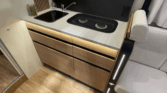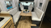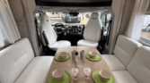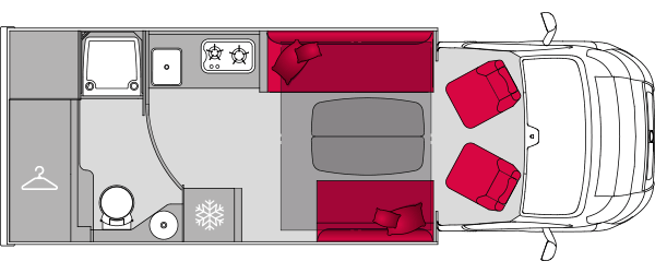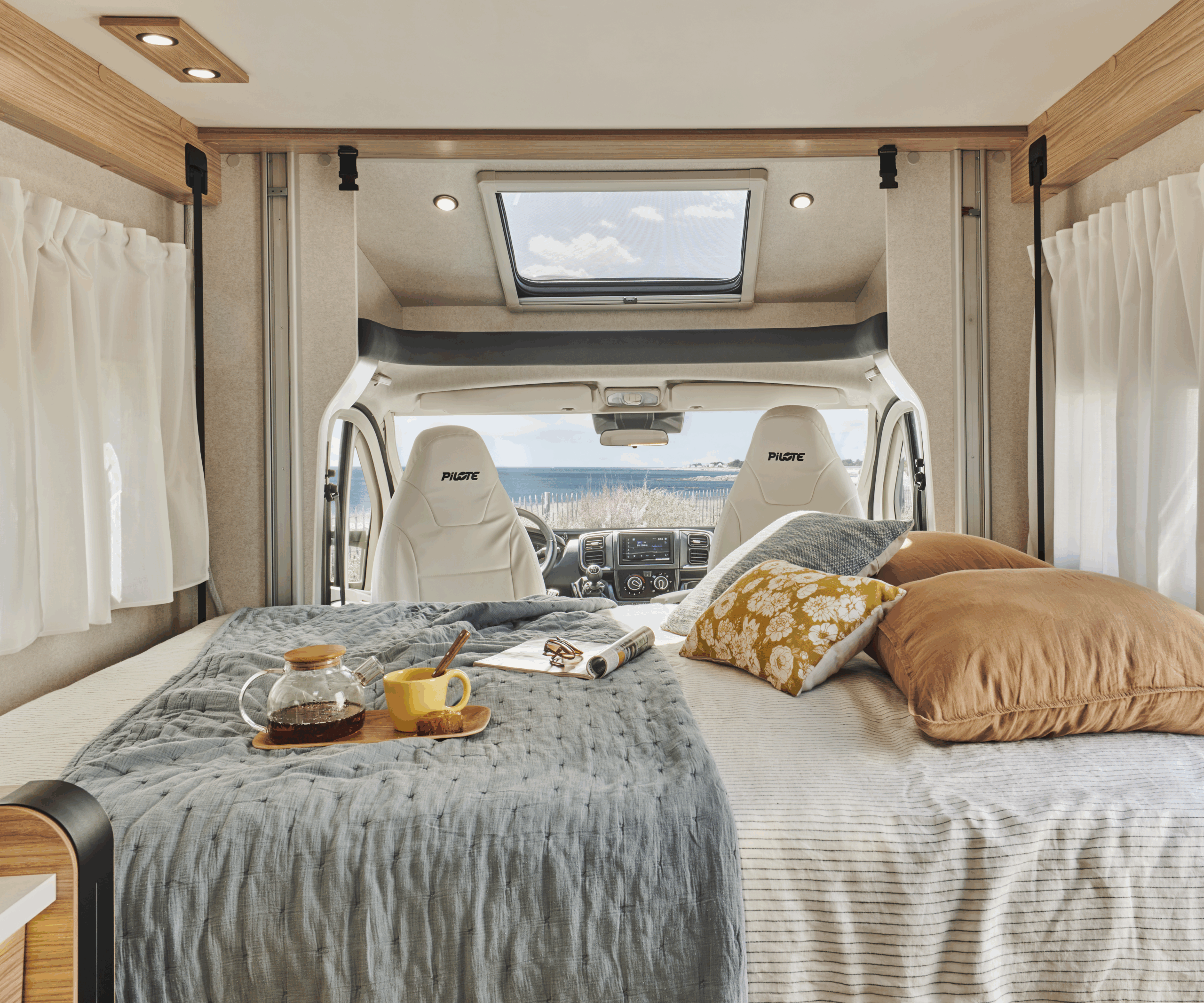 • Ce camping-car dispose d’un lit pavillon électrique qui descend pour offrir un couchage confortable (environ 160 x 200 cm). Un couchage supplémentaire peut être aménagé dans le salon