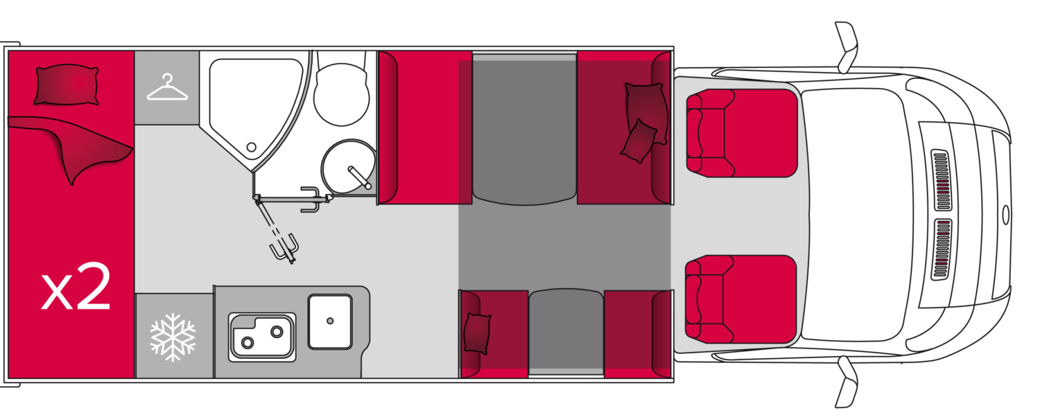 • Sur ce profilé proposé par Pilote, il existe donc six places de couchage. Le salon en dispose de quatre, les deux du lit pavillon (1M35 X1M95) et deux grâce à la transformation de la banquette (1M40 X 2M00).